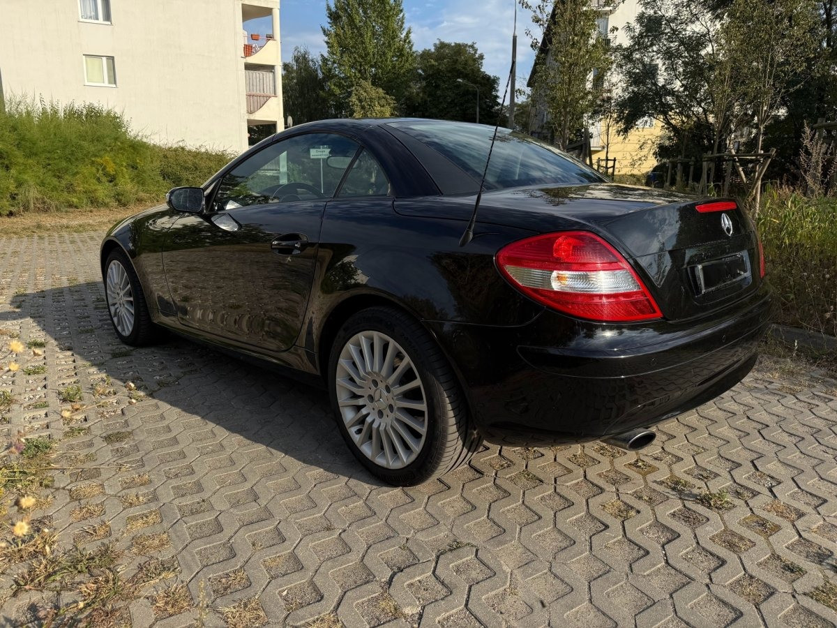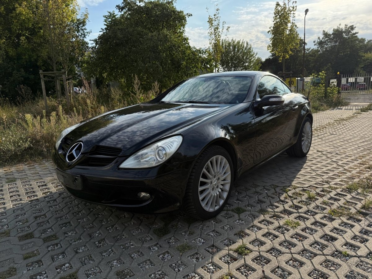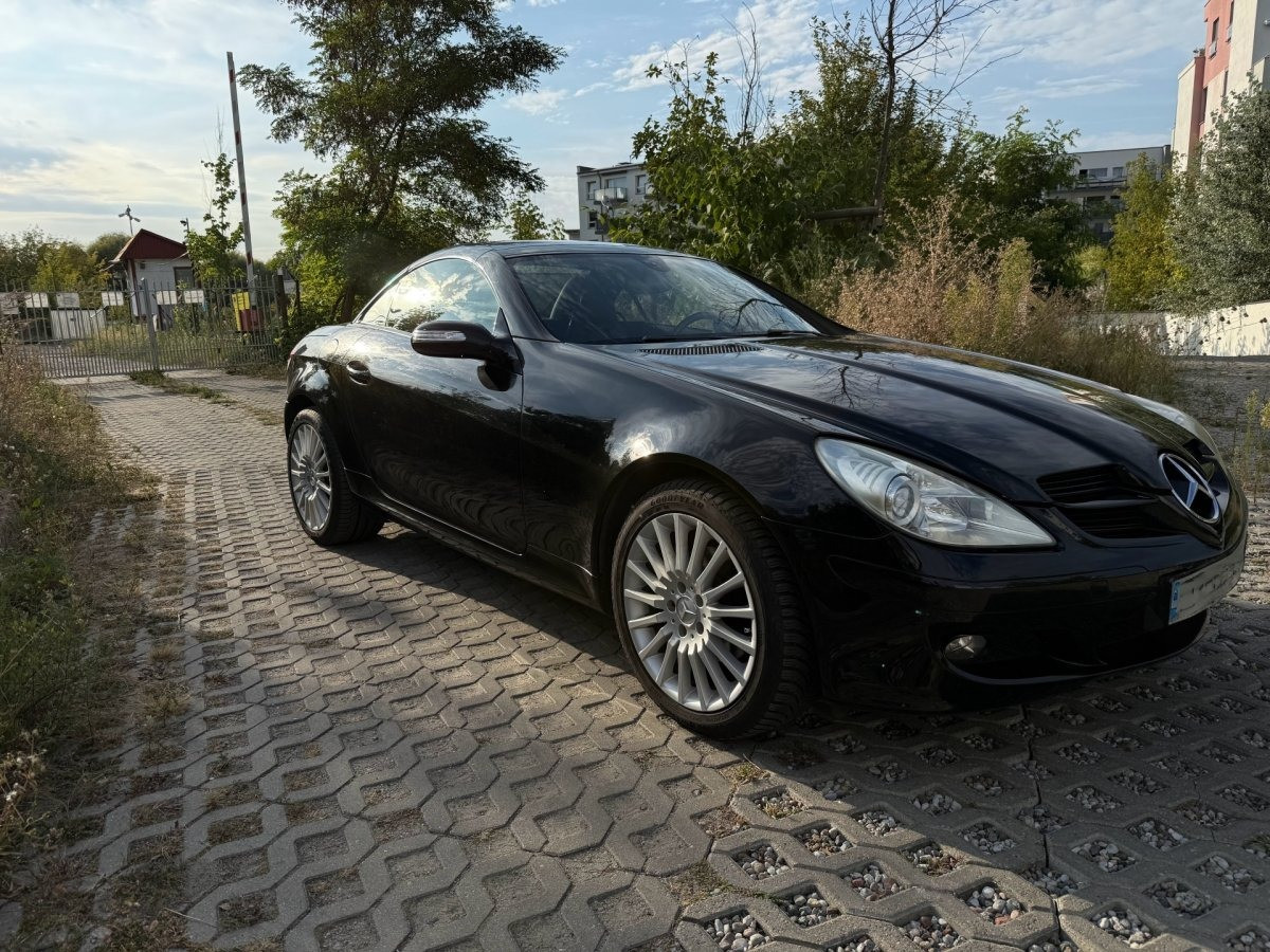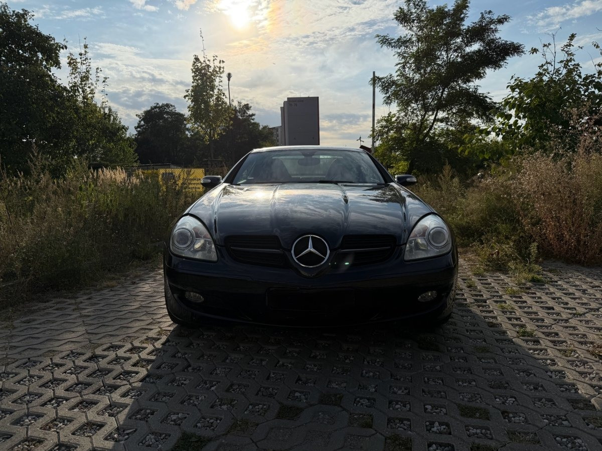 Zadbany, bezrdzewny kabriolet Mercedes SLK 200 Kompressor — gotowy do jazdy, dach otwiera się i zamyka bez problemu. Idealny dla miłośnika klasycznych roadsterów, który chce bezawaryjnego auta do przyjemnej jazdy.